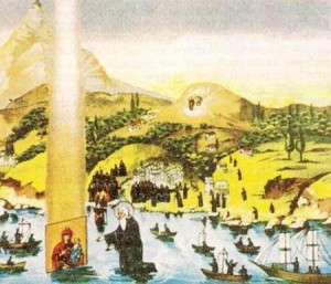 Când vergeaua arzătoare a fost văzută de la cer până la mare, ea arăta locul unde a fost găsită icoana, iar descoperirea a fost făcută de un pustnic ivirit, sfântul Gavriil, care s-a coborât din munte şi a mers pe mare ca pe pământ uscat. El a ridicat marea icoană, iar monahii au aşezat-o cu mare cinste în altar. Dar Maica Domnului i-a spus egumenului: